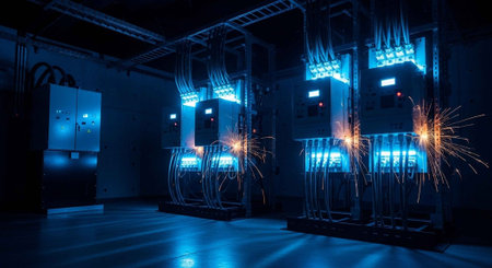 A dark room with electrical equipment and sparks flying everywhere, illuminated by blue lights