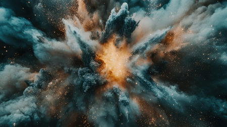 A dynamic explosion dominates the frame, showcasing a central cloud of smoke and radiating bursts of energy. The composition features contrasting colors of dark blue and bright gold, suggesting a powerful event. Suitable for illustrating concepts such as force, destruction, or impact, it is ideal for commercial applications.