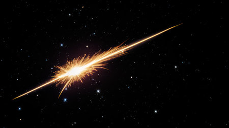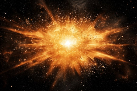 mesmerizing burst of golden particles expands outward, leaving glowing trails that radiate energy and heat. This stunning cosmic explosion captivates with its vibrant intensity.