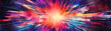 An explosion of vibrant colors and dynamic light creates an immersive cosmic effect, evoking a sense of movement and energy in an abstract space background.