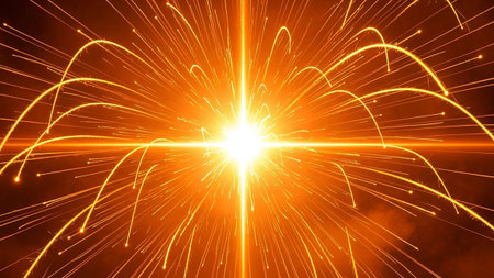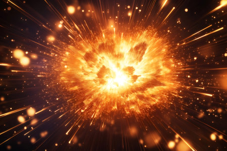 Golden explosion emitting glowing particles and light rays on a dark background, perfect for science fiction and fantasy projects