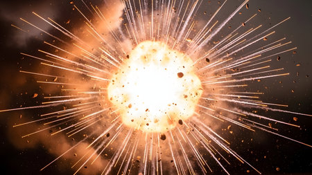 A massive explosion with fire and smoke in the air, creating a dramatic and intense scene. The explosion is centered, with debris and sparks radiating outward, set against a dark background.