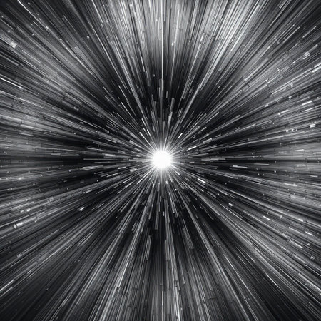 This image captures a stunning cosmic burst, radiating from a central point. The black and white contrast emphasizes the intricate patterns of light streaking outward in all directions. The burst creates a sense of depth and motion, evoking the vastness and mystery of the universe.
