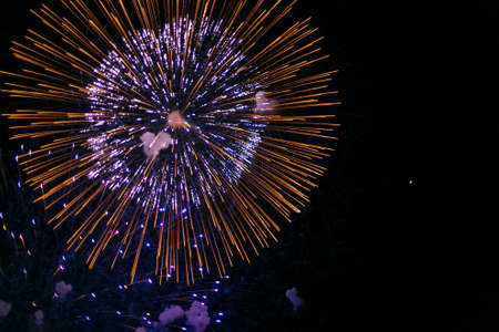 Beautiful colorful holiday fireworks on the black sky background, long exposure