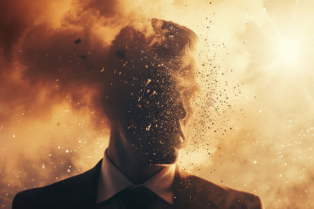 A man in a business suit with his head exploding into flames, symbolizing stress or burnout, set against a smoky background.