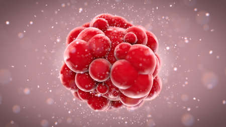 A macro closeup of a red flesh cell in a body with various sized tumors attached to it - 3D render