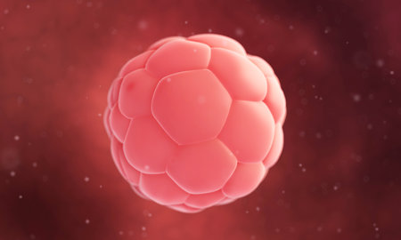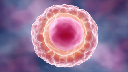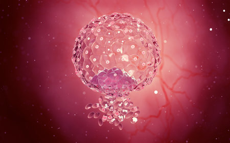 This detailed illustration depicts a human embryo in a scientific context. The circular composition features multiple cell structures, showcasing a layered arrangement. The color palette includes warm tones like beige and brown, contrasting with blue hues. This image is suitable for various medical, educational, and research publications.