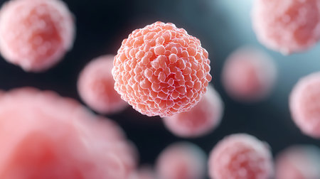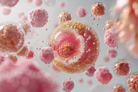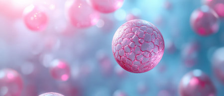 A vibrant display of pink cells is suspended against a soft blue background, creating an ethereal atmosphere. The spherical shapes exhibit intricate textures, evoking a sense of microscopic beauty.