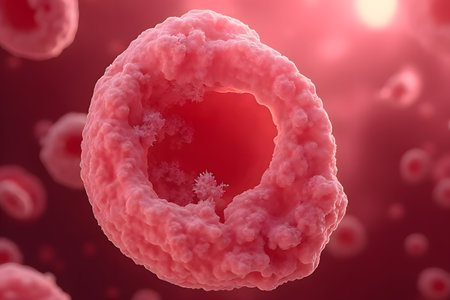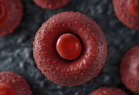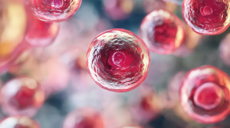 Stunning closeup of vibrant cells floating in a dynamic environment. Perfect for science and health themes, emphasizing exploration and microscopic beauty in biology.