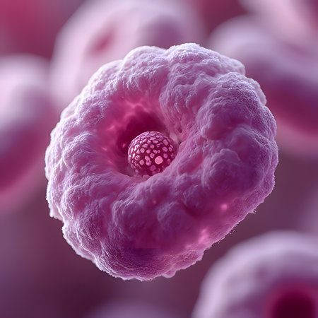 This vibrant depiction explores cellular structures under a microscope, showing intricate details in pink and blue hues during early morning research.