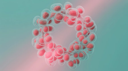 Clean 3D render of a ring or circular cluster of biological cells with red nuclei, floating in a fluid environment. Represents cellular biology, stem cell research, cell communication, life science, and biomedical innovation.