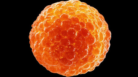 Orange central cell in sharp focus with textured membrane and soft background blur, dramatic lighting emphasizes surface anatomy and biochemical context for educational and editorial use