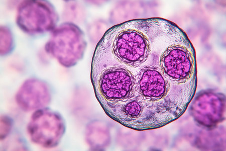 Cyst of Balamuthia mandrillaris amoeba, 3D illustration. A free-living protozoan in soil and water, can cause granulomatous amoebic encephalitis. Both cysts and trophozoites are infectious forms for humans