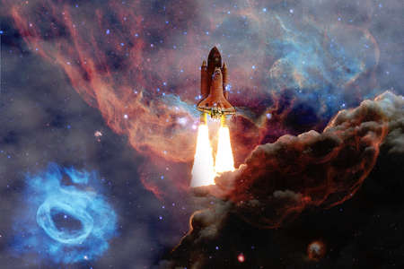 Space rocket launch into the starry sky. Space shuttle with blast and blast lift off into space on a dark background. Successful start