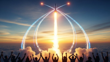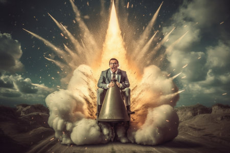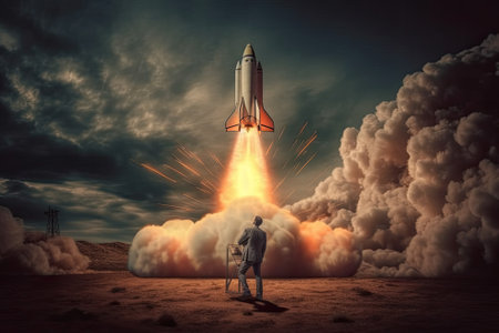 Embark on a journey of innovation and ambition with this captivating image. A rocket launch symbolizes the spirit of startups and the dynamic nature of the business world. This concept captures the excitement and determination that drive entrepreneurs and their quest for success. The fiery propulsion of the rocket represents the power of ideas and the drive to reach new heights. Perfect for projects related to startups, entrepreneurship, business concepts, technology, innovation, and the pursuit of ambitious goals
