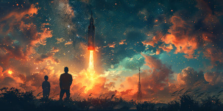 Rocket launch observed by onlookers, fitting for innovation and exploration concepts. Postcard for the day of the father. With Generative AI technology.