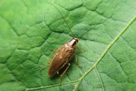 The cockroach perched on green leaves in the garden.
