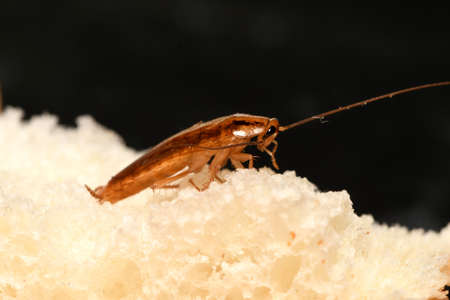 The problem in the house because of cockroaches living in the kitchen.Cockroach eating whole wheat bread on wood cutting board background. Cockroaches are carriers of the disease.
