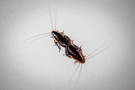 Macro photo of an adult red cockroach alive on white surface. Disgusting domestic insects