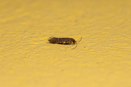 Common clothes moth (Tineola bisselliella) on light fur, closeup