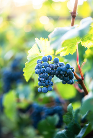 A cluster of ripe blue grapes basks in the warm glow of the setting sun, hanging from a vine in a picturesque vineyard. The sunlight filters through the leaves, highlighting the round, plump berries ready for harvest.