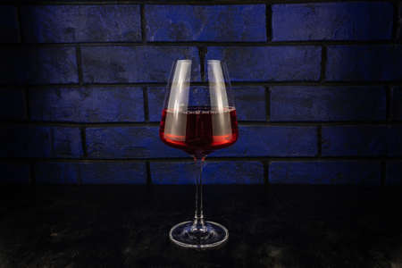 Glass of red wine on blue background with dark shadow.