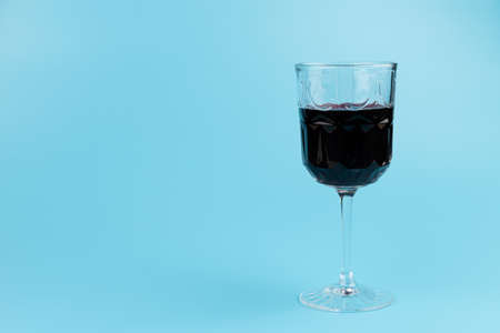 Red wine in glass on blue background with copy space