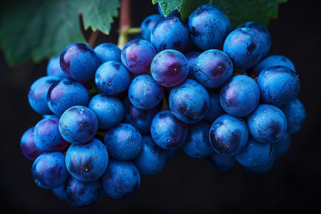Fresh bunch of black grapes with water drops on dark blue background.