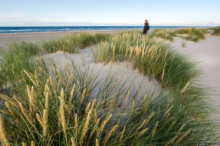 Young woman hiking in coastal dune grass at beach of North Sea.