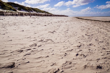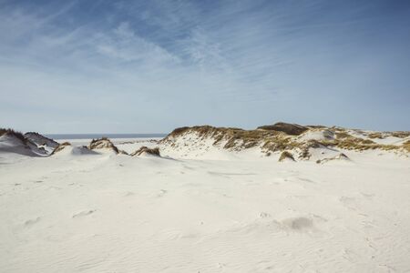 White sand dunes and dry grass on the shore with footprints on surface. Low angle landscape with bright cloudy sky at North Sea coast