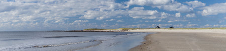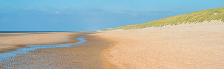 Panorama White sand beach at the Northsea side of The Wadden island Terschelling with dunes and sea Netherlands Europe
