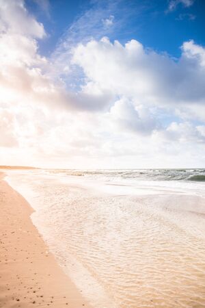 Baltic sea coast (sand dunes) after the storm at sunset. Dramatic sky, glowing clouds, wind. Autumn landscape. Nature, environment, ecology, fickle weather, climate change