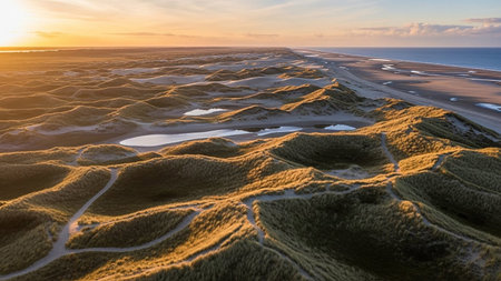 Aerial view of sand dunes at sunset. Dunes in the Netherlands