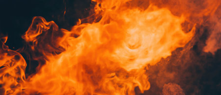 Witness the captivating power of fire with this intense image. A close-up view of fire flames takes center stage against a dark black background, creating a mesmerizing and dynamic composition. The vibrant and flickering flames create a sense of energy and intensity, while the black backdrop adds depth and drama to the scene. Perfect for projects related to heat, energy, passion, danger, and the elemental force of fire