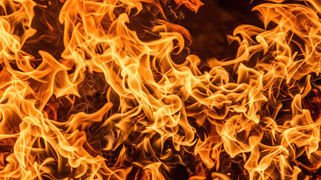 A captivating display of intense flames in vivid orange and yellow tones creating a dramatic backdrop. The energy and heat of the fire evoke a sense of chaos and power. Perfect for themes related to nature, intensity, and danger.