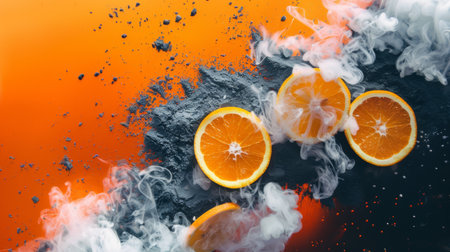 An artistic composition of sliced oranges surrounded by smoke and charcoal on an orange background. The contrasting elements of the vibrant fruit and dark charcoal create a visually striking image with a unique, dramatic atmosphere.