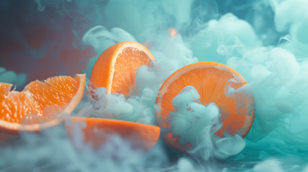 A juicy half orange surrounded by a mysterious smoky effect and vibrant lighting, creating a dramatic and artistic composition. Perfect for food and beverage themes.