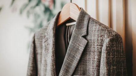 A stylish gray blazer elegantly hangs on a wooden hanger, showcasing its fine texture against a softly blurred background, perfect for fashion or interior decor themes.