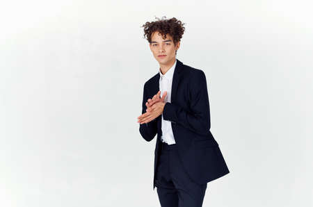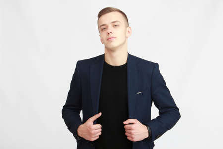 Stylish handsome businessman in a black suit and white shirt posing at the black background