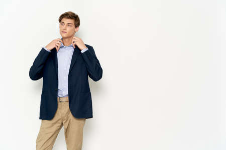 Portrait of a handsome young man in a blue suit standing in an office. Men's beauty, fashion.