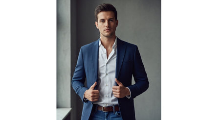 A young handsome businessman dressed in a button-up suit preparing to go to work.