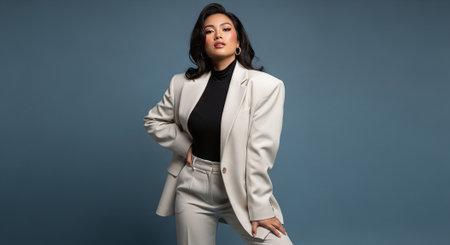 A woman with curly hair stands confidently in a stylish blazer and tailored trousers. She exudes poise and elegance, with natural light illuminating her features in a modern indoor setting.