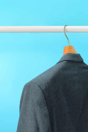 Jackets and other clothes are at hangers. Focus on grey coat. Nobody. Close up