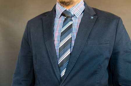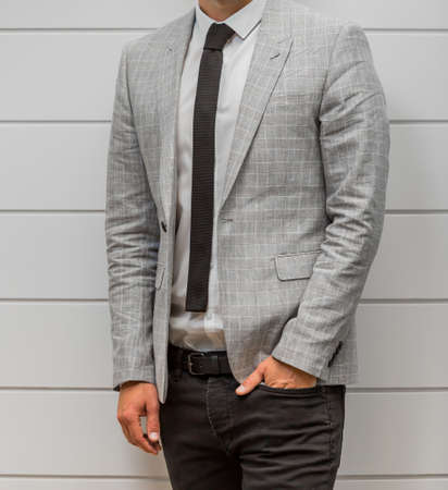 Close up cropped caucasian man hands and arms in a smart grey suit