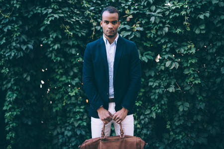 Always in style. Handsome young African man in smart casual wear carrying bag and looking at camera while standing against green plant background outdoors