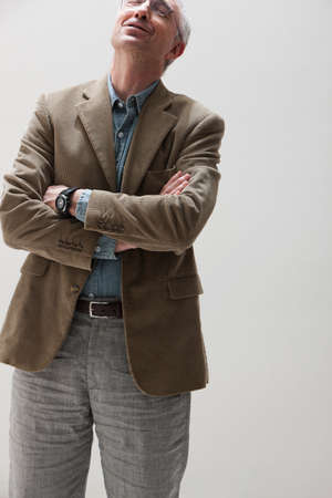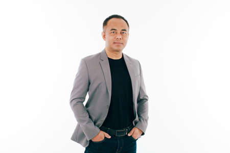 Portrait of self-confident middle age senior Asian man in a black t-shirt and grey jacket.