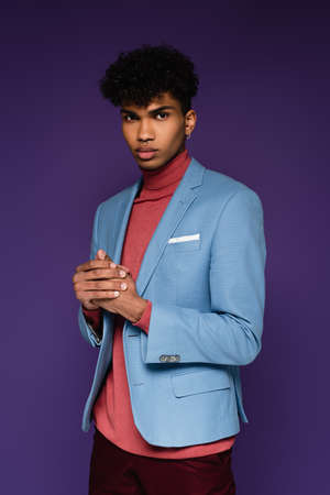 Knitted red waistcoat, classic purple jacket and tie. Close up.