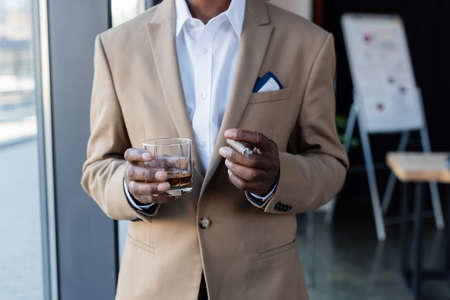 cropped view of senior african american businessman with cigar and glass of whiskey in office