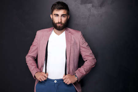 Elegant young handsome man posing in studio, looking at camera. Man with beard.
