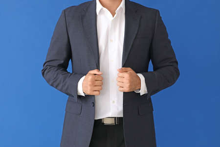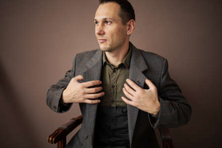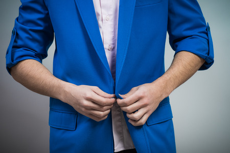 Cropped photo of white clever business people standing confidently, fastening his blazer with stubble on face isolated grey color background